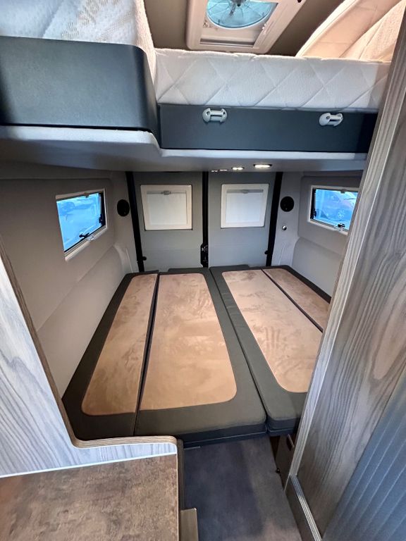 Neueste Version 2025 für 4 Personen Personen , großzügigens einzigartiges Raumgefühl , großes Bad mit Schwenkwaschbecken (Duschen ohne Vorhang , . großes Elektrisches Hubbett rechte Seite 197cm linke Seite 170cm