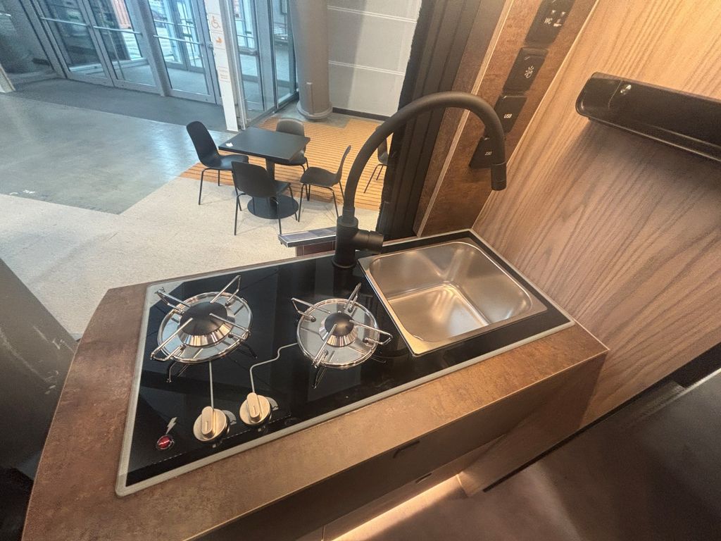 140L Slim Tower Kompressor Kühlschrank, Glaskochfeld (Gas) mit separater Spüle und flexiblem Wasserhahn Airlineschienen mit Zurrgurten , Heckfliegengitter, Aussendusche und Aussengasanschluss